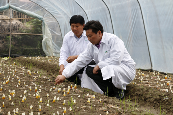 5月14日,余春富董事長前往大別山,考察斑竹園靈芝基地和吳家店光伏配套實驗基地,基地負責人李文海詳細報告了目前大別山區氣溫情況,正值菌棒下地栽培時節。前期提前栽培的一個試驗性大棚已發芽成長。