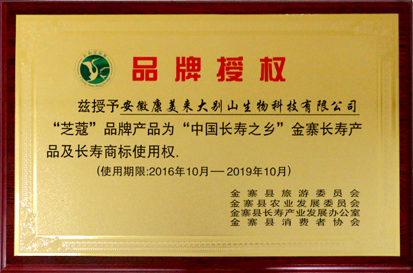 經過縣旅游委員會、農業發展委員會、市場監督管理局和長壽產業發展辦公室嚴格評選,并經縣政府同意,授予安徽省康美來大別山生物科技有限公司“芝蔻”品牌產品為“中國長壽之鄉”金寨長壽產品及長壽商標使用權。