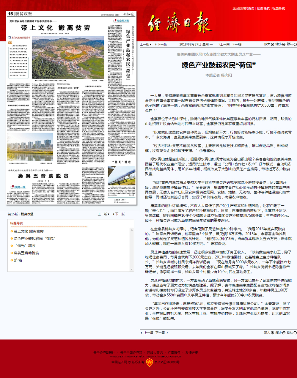 2018-08-29 來源:康美來8月27日,《經(jīng)濟(jì)日報(bào)》15版扶貧攻堅(jiān)板塊刊發(fā)《康美來集團(tuán)以現(xiàn)代農(nóng)業(yè)理念做大大別山靈芝產(chǎn)業(yè)——綠色產(chǎn)業(yè)鼓起農(nóng)民“荷包”》的記者文章,特別報(bào)道了康美來集團(tuán)通過現(xiàn)代化靈芝種植,帶領(lǐng)大別山區(qū)近萬戶貧困農(nóng)民精準(zhǔn)脫貧。