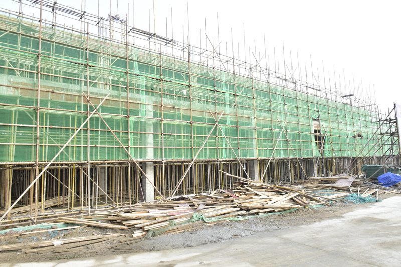 6層高的高檔公寓樓已經完成封頂,腳手架林立,預計2019年3月前完成墻面工程。