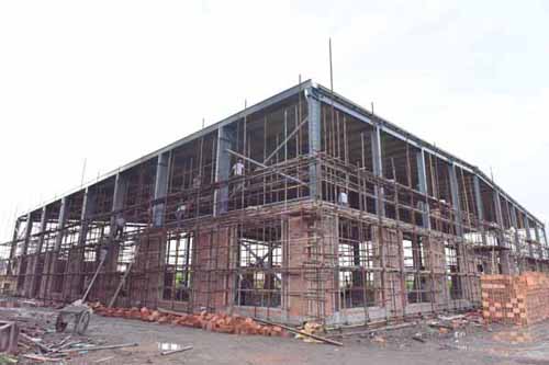 然后余董進(jìn)入正在建設(shè)的第二幢廠房培訓(xùn)中心。培訓(xùn)中心鋼結(jié)構(gòu)廠房目前正在墻面施工中,工人們正在壘磚砌墻。