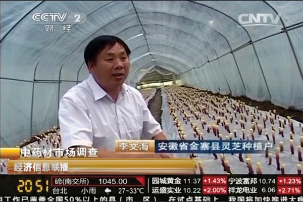 五、縣政府部門(mén)指定康美來(lái)基地作為金寨縣靈芝種植基地的代表,向央視推薦。李文海是種植能手的代表。